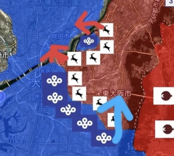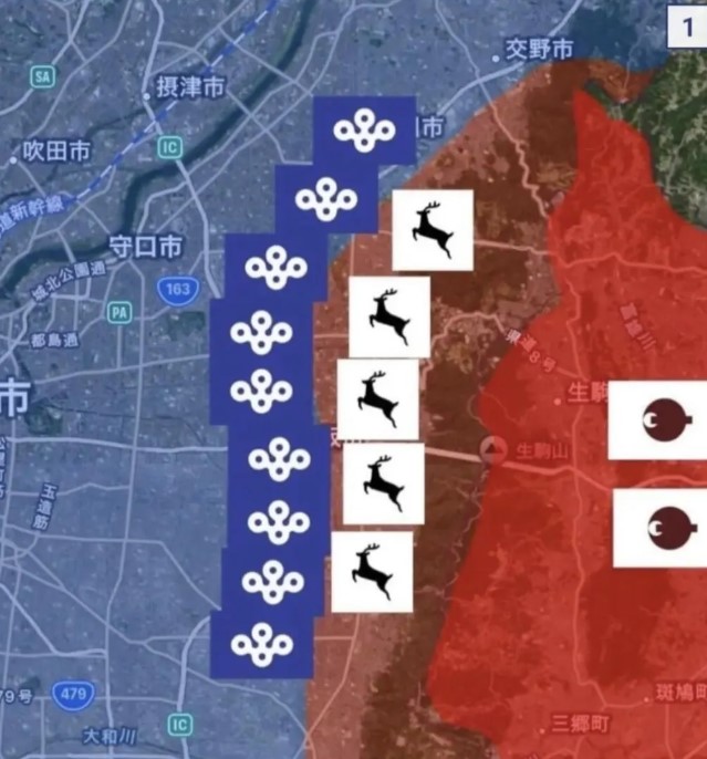 奈良公園の鹿たちがたくさん山を越え大阪に進む