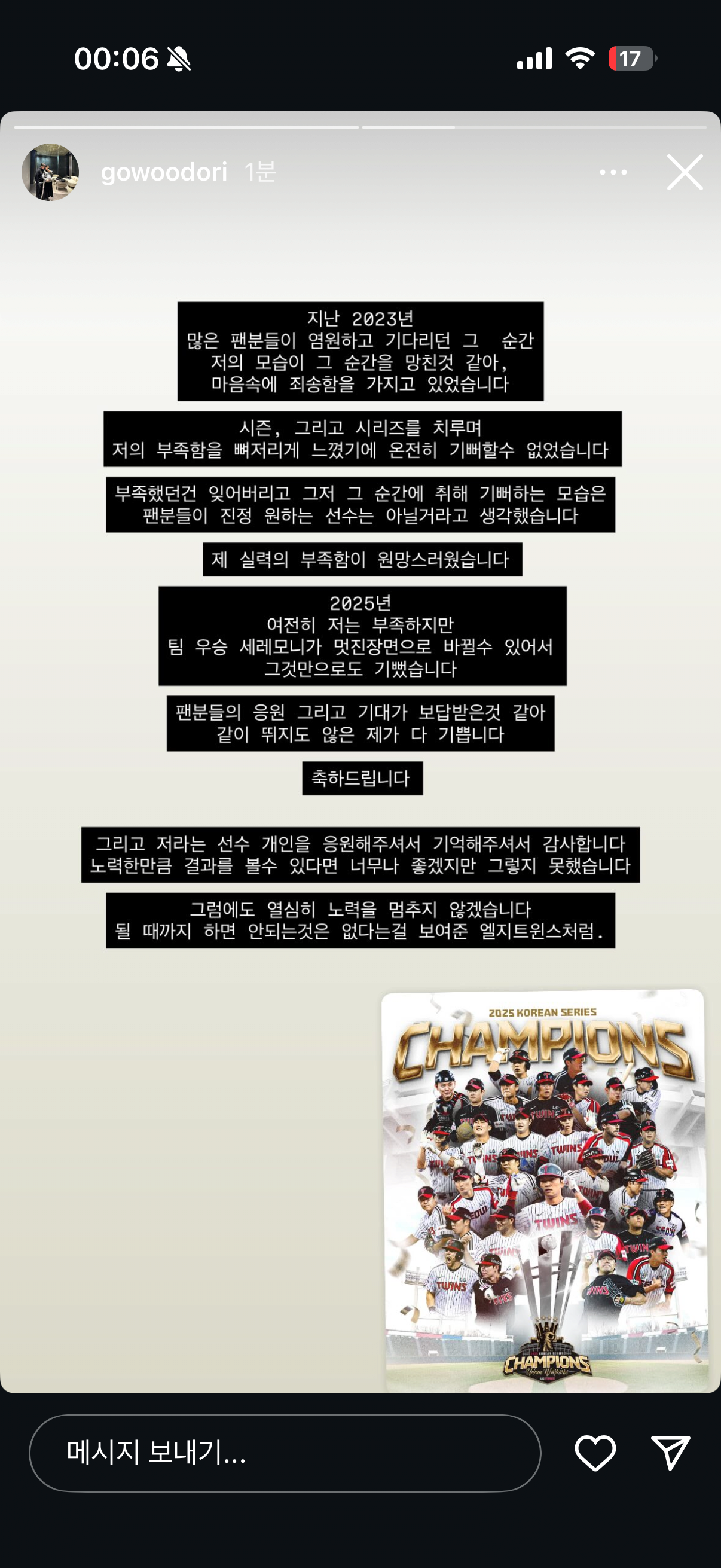 2023年は個人としてはあまり良い成績ではなかったが所属チームであるLGツインズは韓国シリーズで優勝した
