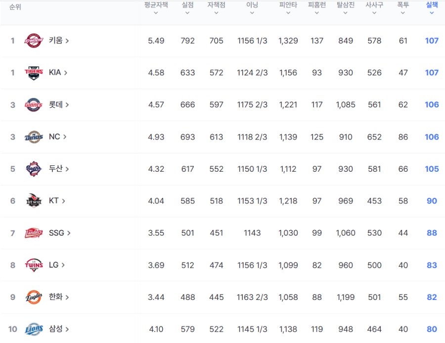 現時点のエラーの数は韓国ではサムスンライオンズが最も少なく80個だ