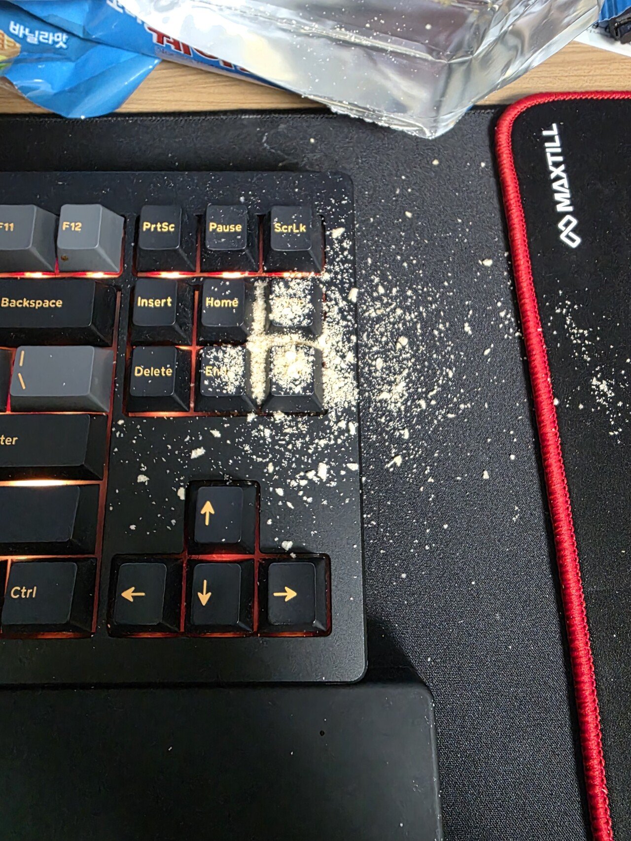 パソコンやってる時に腹が減ってウエハースを食べたんだけど容器の奥にまだ残ってると思って逆さまにしたらこんなことになってしまいました
