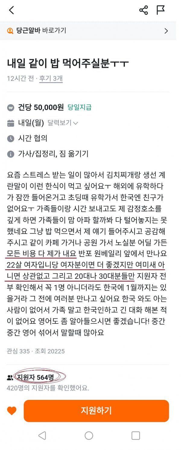 I’ve been under a lot of stress lately, so I want to eat Korean food like kimchi stew and fish eggs. I came here for a while after studying abroad, and I didn’t have any friends in Korea because I went to study in elementary school. I haven’t talked about it all because I’m afraid that if I spend time with my family and deepen my emotional appeal, my family will be heartbroken. Just listen to me and sympathize with me while eating, and go to the cafe or go to the park with me. I’ll meet you in front of Banpo One Bay. I hope it’s a 22-year-old woman. It doesn’t matter if it’s a girl, but it doesn’t matter if it’s not Yeo Mi-sa, and only those in their 20s and 30s will be in Korea until January, even if it’s not one person. I want to meet you before that. I’ve never had a long conversation with Koreans other than my family because I don’t know anyone even if I come to Korea. I hope you can understand some English! I often mix it up in the middle and speak English