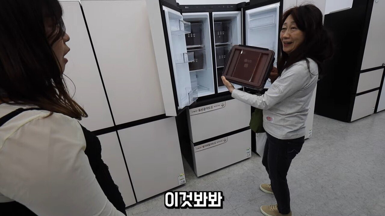 扉を開けのだが普通の冷蔵庫と構造が違う。冷凍庫もなければ野菜室もない。全体の形は冷蔵庫だけどなんか違う。それがキムチ冷蔵庫だと教えるとビックリ仰天。まさかこんなに大きく値段も50万円するとは…。キムチ冷蔵庫の事は話には聞いたことがあるようだけど実際に店で見たのは初めてらしい。とても大きく価格も高い事に驚いた様子。店内を時間をかけ見回った後に日本の家電量販店と韓国の店を比べて一番違ったところはどこですかと尋ねると「キムチ冷蔵庫!」と答えた