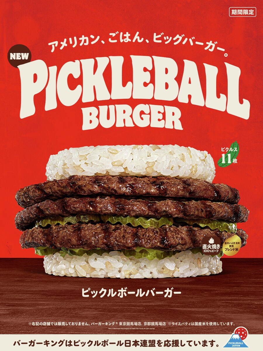 大型ごはんバーガー「ピックルボールバーガー」を明日から期間限定で販売するそうです。とてもアメリカンなサイズですね。ビーフパティ3枚とピクルス11枚。しかもパティが米なんだって!5/30からの期間限定らしいです