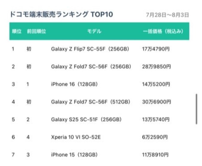 7月28日~8月3日の新製品発売初週の販売数だがドコモオンラインショップ販売によるとフォールド7が1位、フリップ7が2位をそれぞれ占めた。